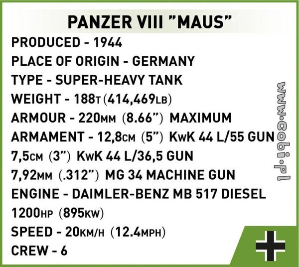 Entdecken Sie die Macht der geheimen Projekte des Dritten Reichs und bauen Sie ein Modell eines superschweren Panzers, der das Schlachtfeld beherrschen sollte! Der Panzerkampfwagen VIII Maus ist nicht nur der größte Panzer der Welt – er ist ein faszinierendes Stück Geschichte, das Sie jetzt mit COBI-Bausteinen nachbauen können.