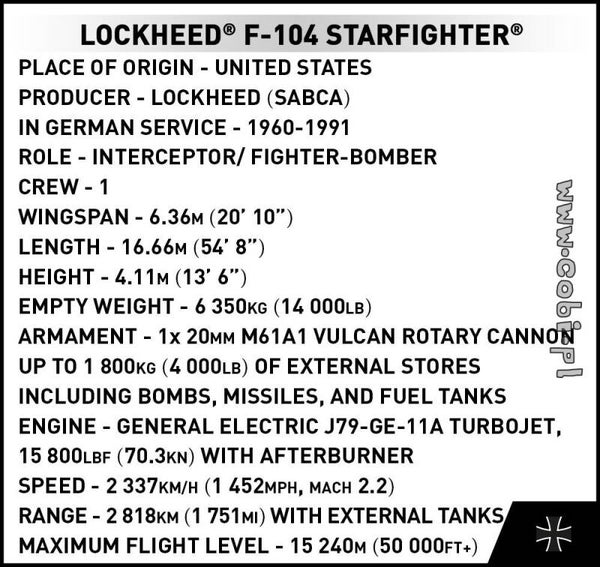 Dieses Modell ist ein weiteres Beispiel für die Zusammenarbeit von COBI mit dem renommierten Deutschen Marinemuseum. Basierend auf der F-104 der deutschen Luftwaffe war es eines von 210 Flugzeugen, die von einem Konsortium aus Messerschmitt, Dornier, Heinkel und SIAT in Lizenz produziert wurden. Sie diente beim Jagdbombergeschwader JaboG 33 mit Sitz in Büchel bei Cochem/Mosel und ist heute ein Exponat im Deutschen Marinemuseum.