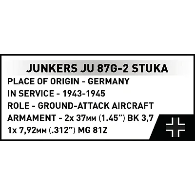 Die Ju 87 G-2 war eine Spezialversion zur Bekämpfung von Bodenzielen, insbesondere gepanzerten Fahrzeugen. Bewaffnet mit leistungsstarken Unterflügelkanonen, wurde die Maschine unter anderem an der Ostfront und unter schwierigen klimatischen Bedingungen eingesetzt, wo Präzision, Ausdauer und Effektivität entscheidend waren. Dieses Klemmbaustein-Modell gibt den Charakter dieser Stuka-Version originalgetreu wieder und kombiniert ihre historische Silhouette mit Details, die sowohl Luftfahrtbegeisterte als auch COBI-Modellbausammler zu schätzen wissen werden.